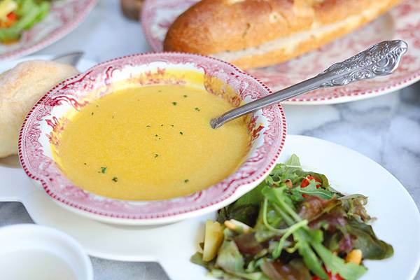 南瓜奶油濃湯🎃每天的主廚湯品都不一樣 這次剛好是我最愛的南瓜濃湯🥣嚴選南瓜與新鮮食材慢慢熬煮,湯頭非常濃郁 有層次